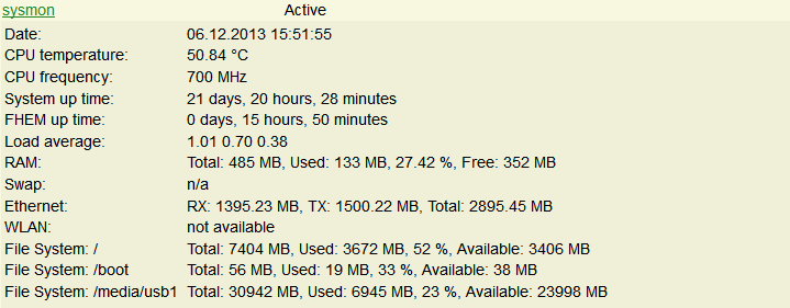 Herausgekommen ist ein Modul, das eine Reihe von Systemstatistiken erfasst und zur Verfügung steht. Es liefert diverse Informationen und Statistiken zu dem System, auf dem FHEM-Server ausgeführt wird. Es werden nur Linux-basierte Systemen unterstützt. Nicht alle Informationen sind auf alles Systeme verfügbar. Bis jetzt getestet auf Raspberry Pi (Debian Wheezy), BeagleBone Black, Cubieboard 2, FritzBox 7390 und einigen anderen.