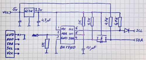 Die erste Version ist sehr sinple aufgebaut. Ein 3,3V-Spannungsregler und PullUp-Widerstände. Dennoch kann dadurch dieses board gleich an ein Arduino angeschlossen werden. Solange sie allein an I2C Bus hängt, wird das ganz gut funktionieren. Bei mehreren Geräten muss man (wie immer) auf die verwendete Spannung und die Gesamtwerte der PullUps Acht geben.
