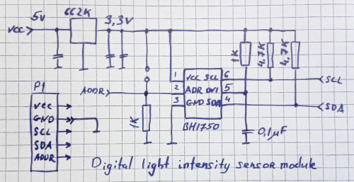 Es gibt verschiedene Möglichkeiten Lichtintensität zu erfassen. Den klassischen Weg der analogen Messung (Lichtwiderstand, Photodiode) habe ich von vornherein ausgeschlossen. Vor allem wegen der erforderlichen Kalibrierung. Zum Glück habe ich leicht einen digitalen (Kommunikation erfolgt über I2C Bus) Sensor finden können: BH1750FVI. Dieser kann Lichtintensität im Bereich von 1 bis 65535 lx (Lux) erfassen. Das ist schon ganz gut. Die Spezifikation besagt, dass der Sensor auch zur Erfassung von Werten von 0,11 bis max. 100000 lx umprogrammiert werden kann. Das ist sehr beeindruckend.