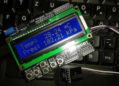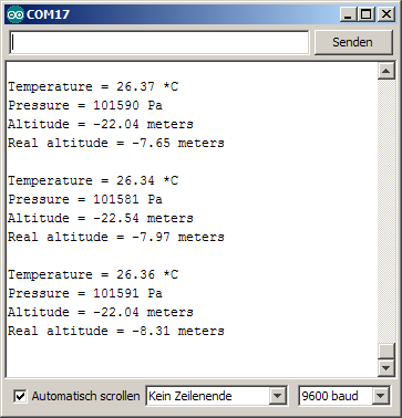 Es fehlt noch die nötige Software. Mit dem folgendem Sketch verwandelt sich ein totes Stück Elektronik in ein Digitalbarometer.