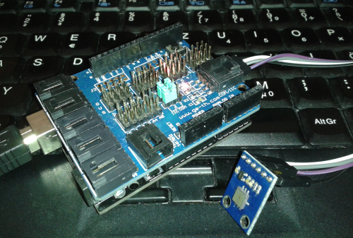Und so sieht das aus. Schrit 1, Arduino UNO mit dem Sensor-Shied: