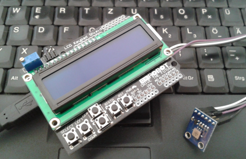 Dafür nahm ich ein anderes Arduino-Board und ein LCD-Shield. Da an den letzten nichts weiter angeschlossen werden kann, steckte ich ein "Sensor-Shield" (Anschlussplatine) dazwischen.