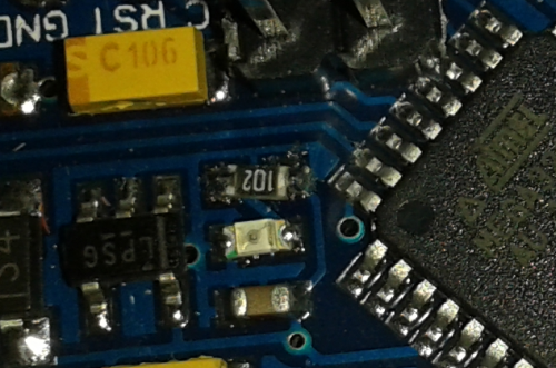 Und noch eine Version. Etwas gewundert habe ich mich über den Zweck der 6 Lötkontakte, die auf den ersten Blick nach ICSP aussehen und die gleichen Signale führen, jedoch bei näherem Hinsehen doch eine andere Belegung aufweisen. Da alle diese Anschlüsse bereits an anderen Pins vorhanden sind, habe ich sie gar nicht erst eingelötet.