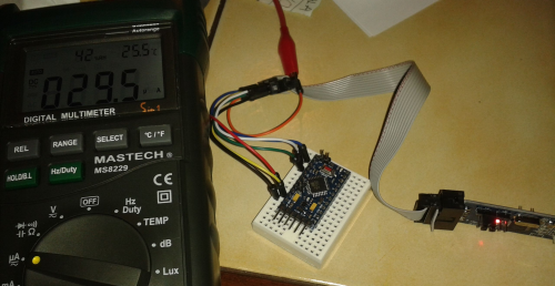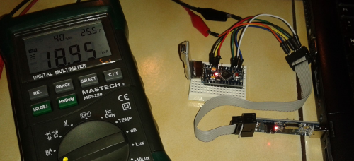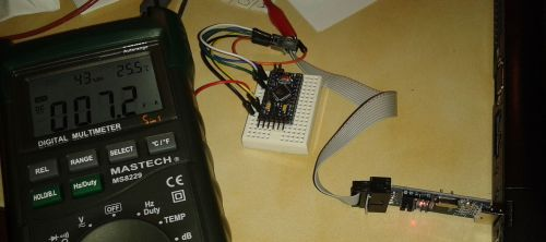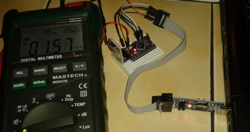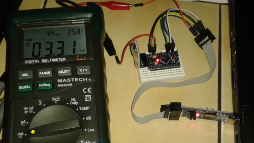Das Board im Bild wird von einem Programmer (USBasp) versorgt. Dieser tut an sich nichts zur Sache. Es war mir damit gerade einfacher, einen Ampermeter in Arduinos Stromkreis einzuschleusen (wollte gerade kein USB-Kabel aufschneiden).