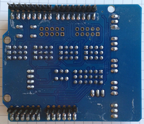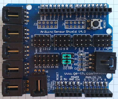 Diese Platine bietet Anschlusmöglichkeiten für Sensoren und Servos in dem für jedes Gerät eine eigene Leiste incl. Spannungsversorgung zur Verfügung stellt.