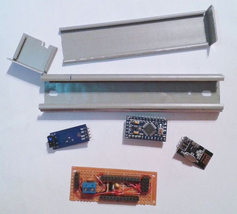 Mechanik bzw. Installationsart und -ort haben mir einiges an Kopfzerbrechen bereitet. Die naheliegendste Idee, Reedkontakte zu verwenden, lies sich zunächt nicht (gut) umsetzen. Ich hab sogar bereits mit Ultraschal-Distanzmesser experimentiert. Letztendlich habe ich mich für eine IR-Schranke entschieden. Der Sensor reagier ganz gut auf alles, was hell ist und sich in einem Bereich von 0,5 bis ca. 3 cm befindet. Er lässt sich leider schnell durch helles Sonnenlicht aus dem Trab bringen, in meiner Garage scheint es jedoch zu funktionieren.